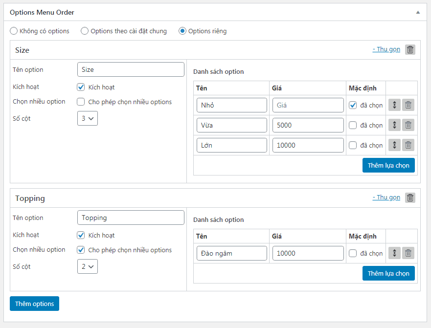 Plugin đặt đồ ăn nhanh, đồ uống online cho WordPress và Woocommerce. Thêm món ăn, đồ uống và option không giới hạn. Bạn có thể thêm mọi option bạn muốn